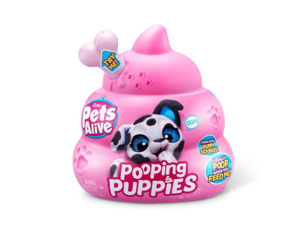 Obsah balení: plyšové štěňátko, malé kostičky, jmenovka, plenka, sběratelský průvodce, obal ve tvaru hovínka. Produkt vyžaduje 3ks baterie typu AAA , které jsou součástí balení.