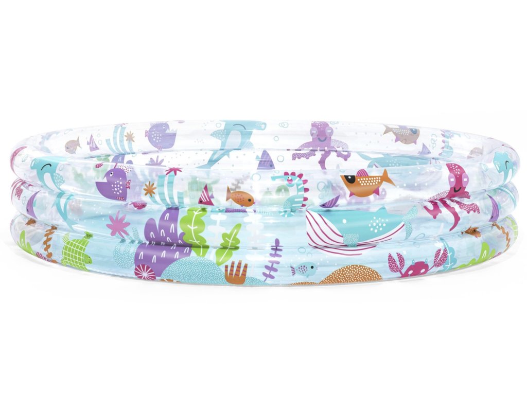 Bazének je vhodný jako brouzdaliště. Tříkomorový nafukovací bazén s motivy mořského světa. Bazének je vyroben z kvalitního PVC o síle 0,19 mm. Obsah: 1x bazén, 1x záplata pro opravy. Assort je náhodný mix modelů. Výběr nelze ovlivnit. Rozměry nafouknutého bazénku:152 x 30 cm. Rozměry nenafouknutého bazénku: 140 x 140 cm. Rozměry balení: 45 x 30 x 3,3 cm. Objem bazénku: 282 l. Používejte pouze pod dohledem dospělé osoby. Věk: 2+