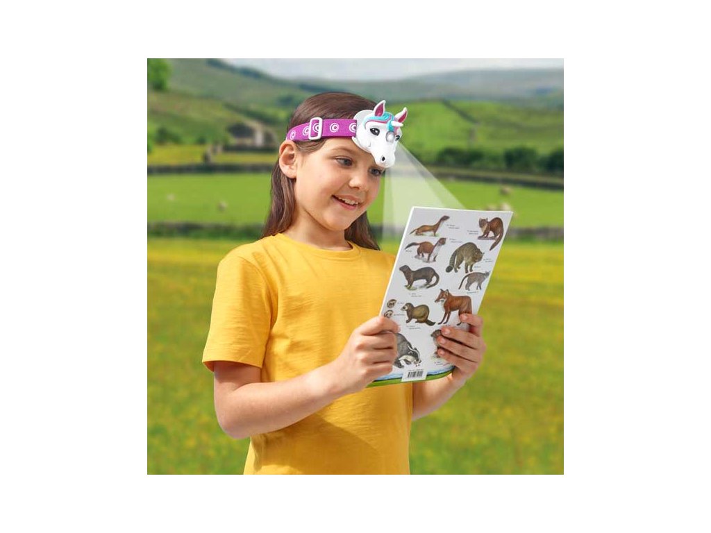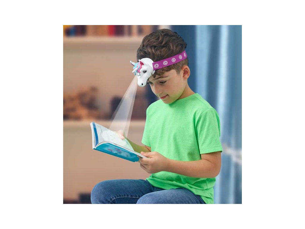 Praktická LED svítilna na hlavu v motivu jednorožce. Kromě svícení je možné aktivovat i magický zvuk.