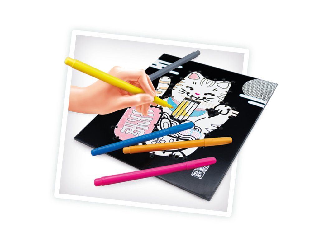 Obrázek vybarvěte pomocí přiložených fixů, provlékněte neonový drát/vodič podle schématu a vložte obrázek do rámu.