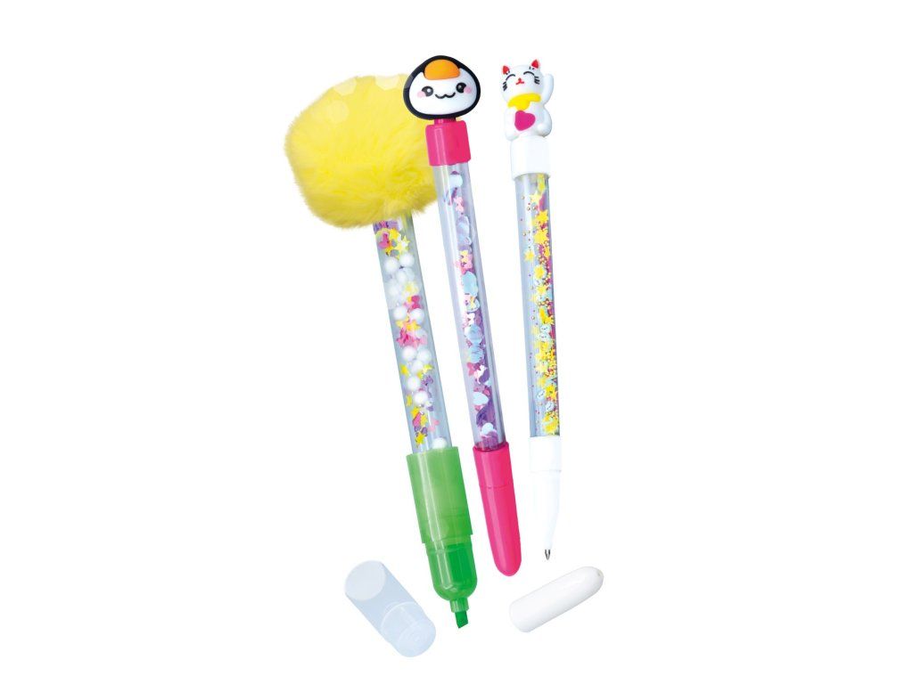 Naplňte pera a zvýrazňovač všemi třpytkami a ozdobami a poté nasaďte figurku nebo bambulku.