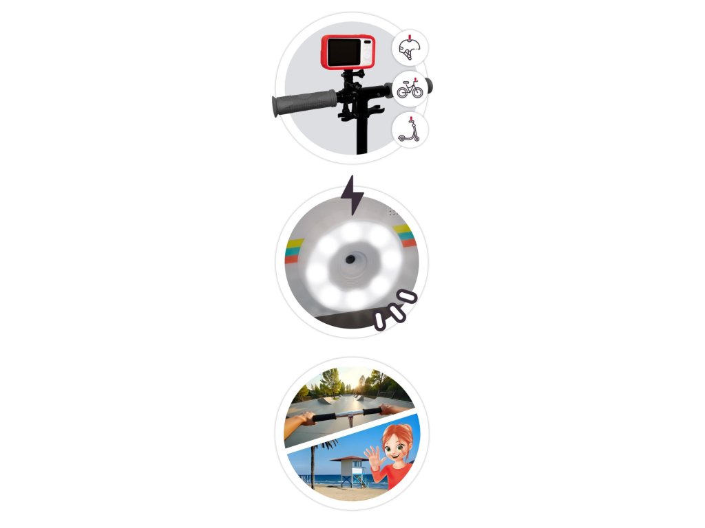 - Silikonový ochranný kryt – zajišťuje bezpečné uchopení; součástí jsou také doplňky pro připnutí kamery na skútr, kolo či helmu