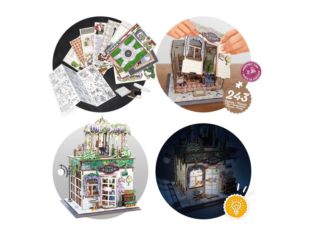 Populární série dřevěných stavebnic DIORAMA 3D s LED osvětlením. Sestavte si vlastní miniaturní květinářství z více než 243 dílků s barevným potiskem.