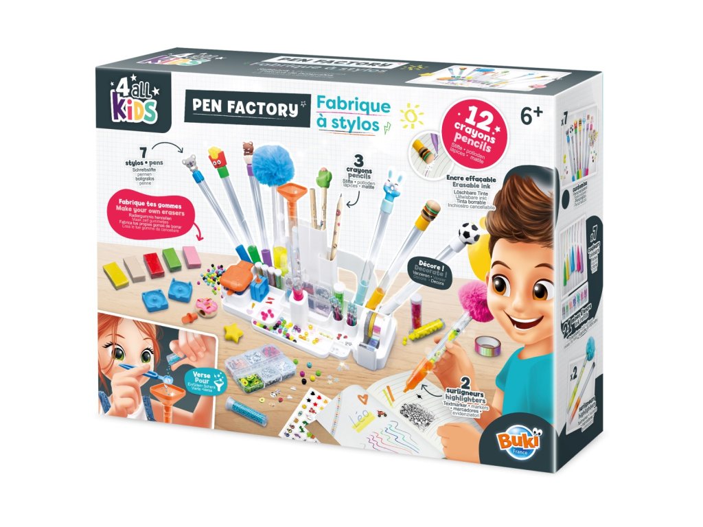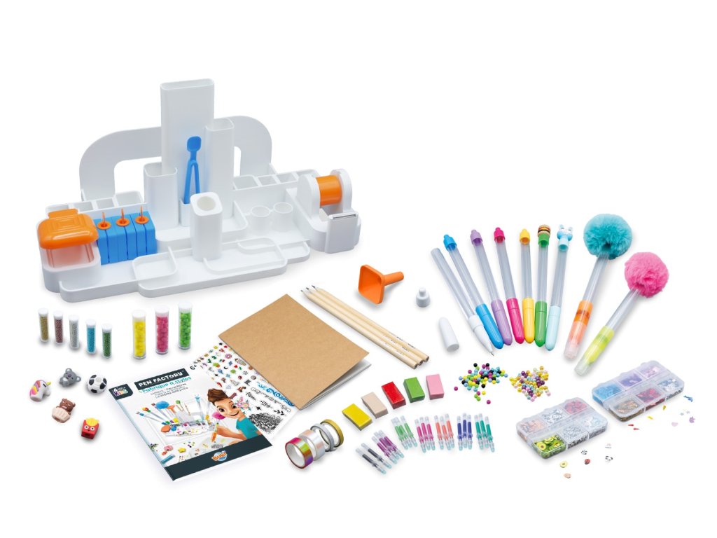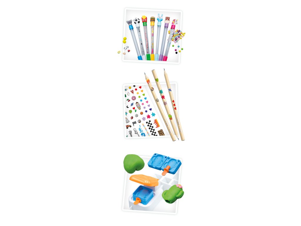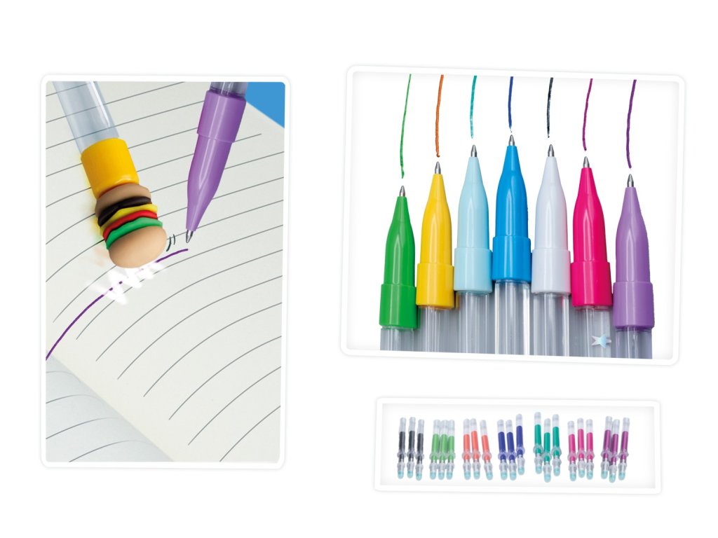 Obsahuje: 7 per, 21 stíracích náplní inkoustu (7 různých barev), 2 zvýrazňovače, 3 tužky, 1 zápisník, 4 role maskovací pásky, 1 arch samolepek, 5 barev gumovací hmoty, 3 formy na výrobu gum, 7 figurek, 1 krabička flitrů, 1 krabička barevných dekorací, 2 velké bambulky, sortiment minikorálky, bambulky, korálky atd.