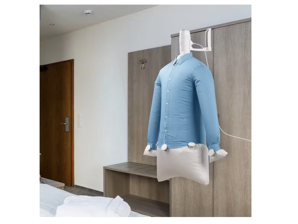 Oblékněte vlhkou košili na balónek, připevněte zátěžové klipy, zavěste na dveře a zapněte přístroj. Pak už jen vyčkejte na dokonale hladký výsledek. -