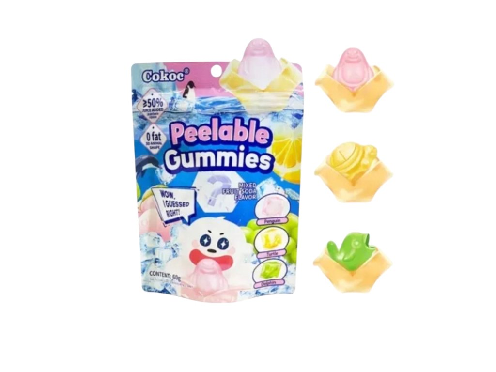 Objevte odlupovací gumové bonbóny Cokoc se směsí ovoce – unikátní odlupovací ovocné želé bonbony , které poskytují zábavnou interaktivní svačinu v balení o hmotnosti 60 g. Každé želé obsahuje měkké, aromatické gelové jádro , obklopené jemnou, snadno odlupovatelnou slupkou , díky čemuž je jejich konzumace čistou zábavou. Produkt je dostupný v exotických příchutích, jako je ovocná soda inspirovaná populárními sycenými nápoji – je to hit pro děti i dospělé.
