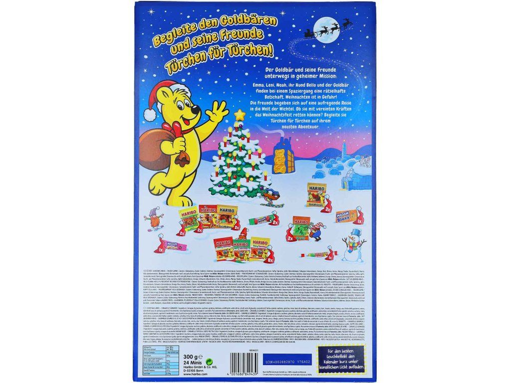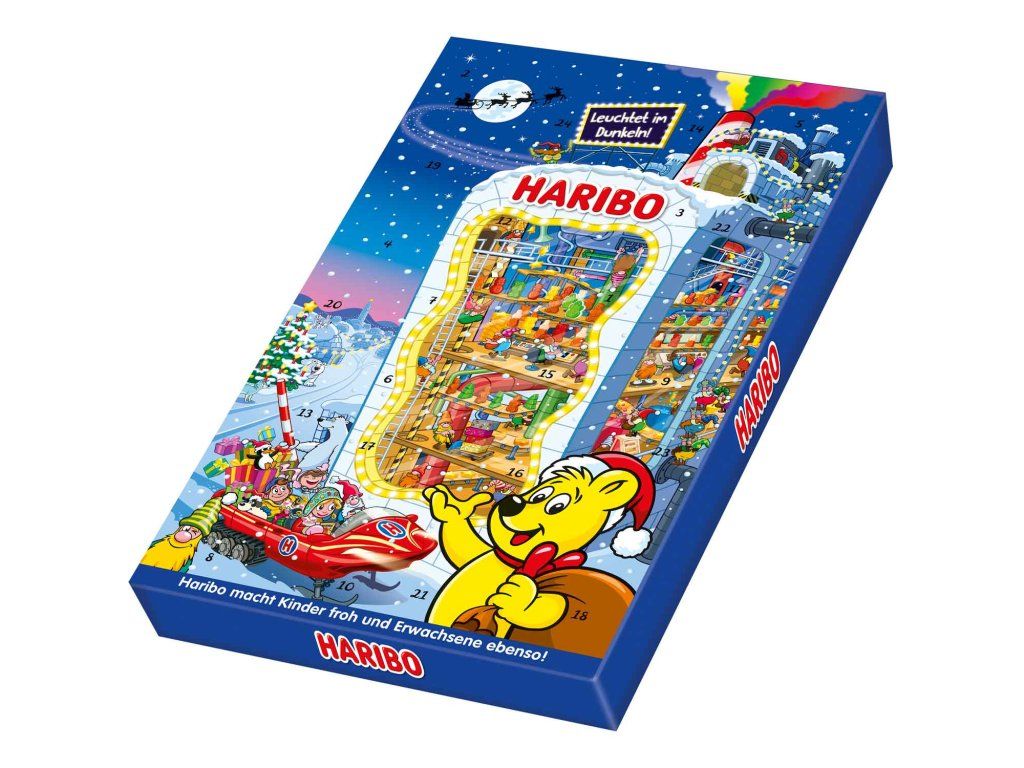 Se sladkým a kyselým překvapením představuje adventní kalendář Haribo ideální předvánoční dárek. Prosvítí každý dětský pokoj a nabízí širokou škálu klasických a vánočních kreací od Haribo a Maoam - kalendář nejen pro děti, ale i pro všechny Haribo fandy. Vraťte se do dětských let. Nadělte si radost!
