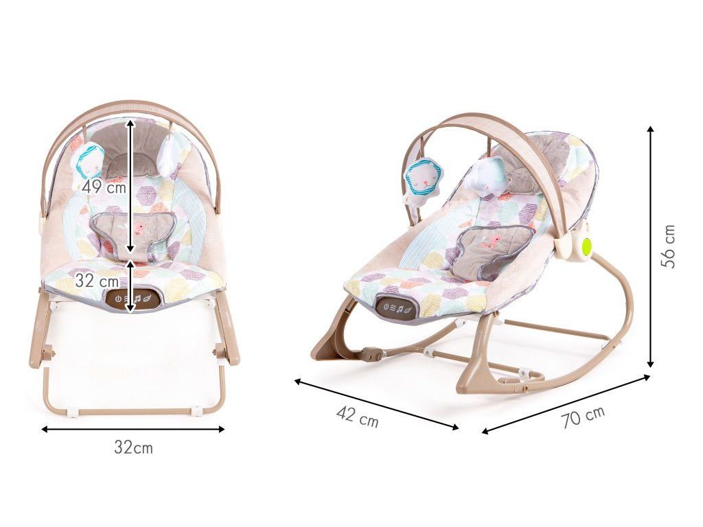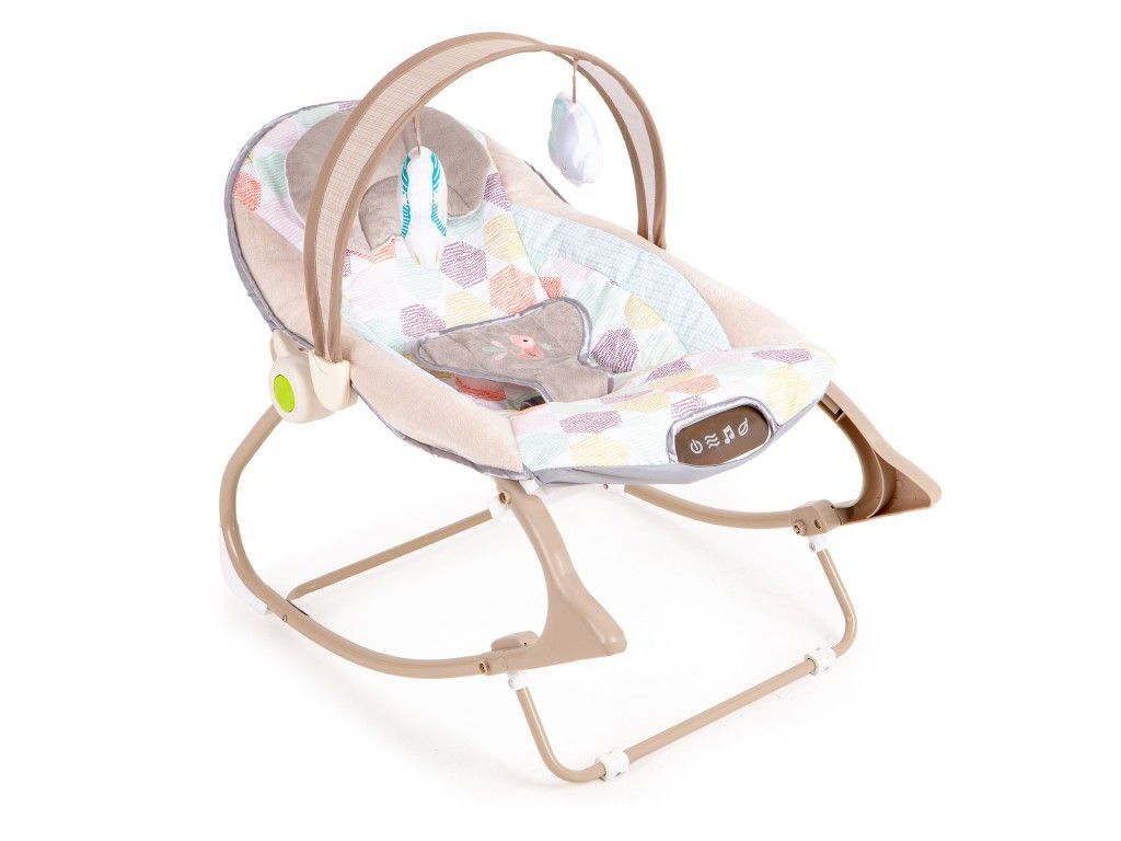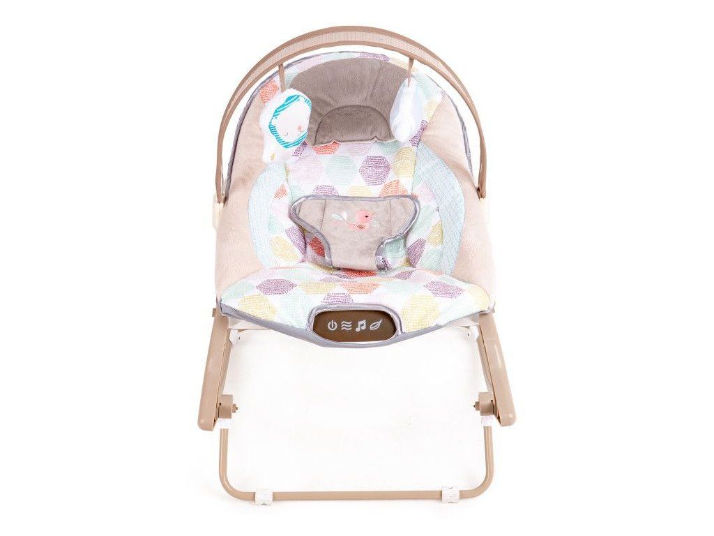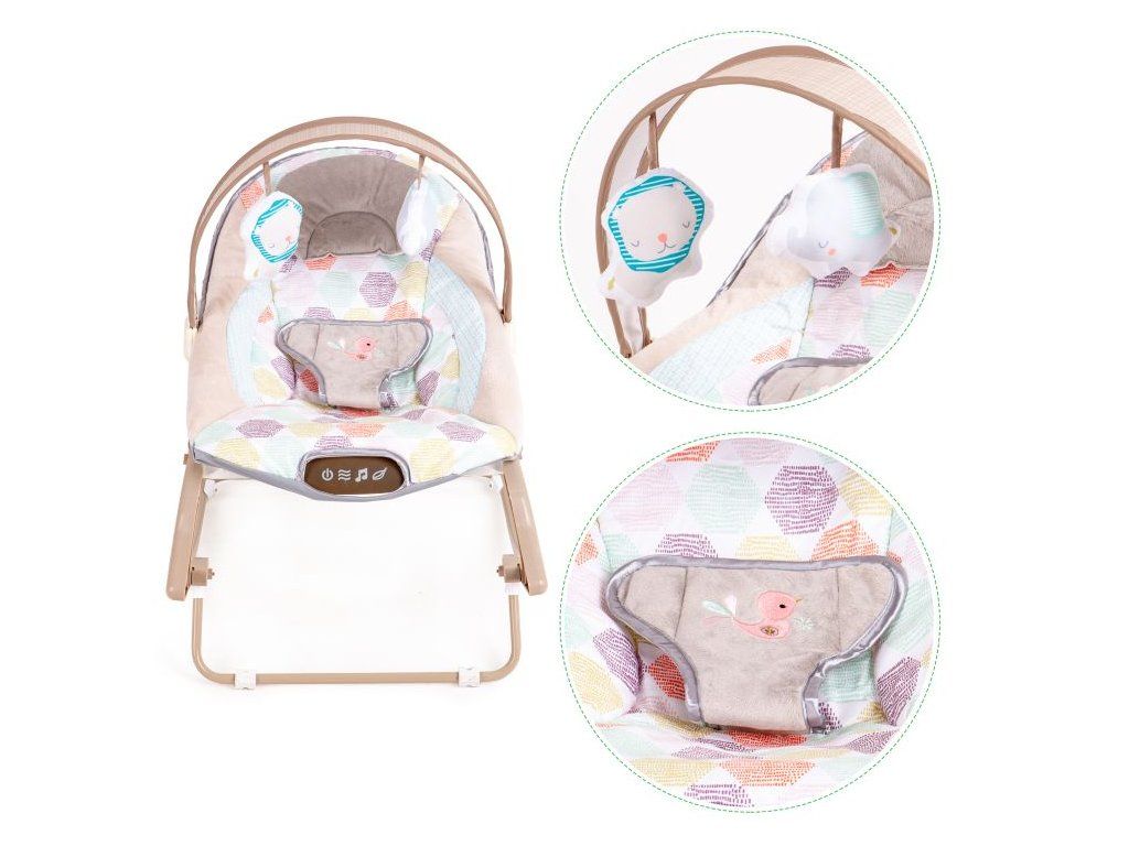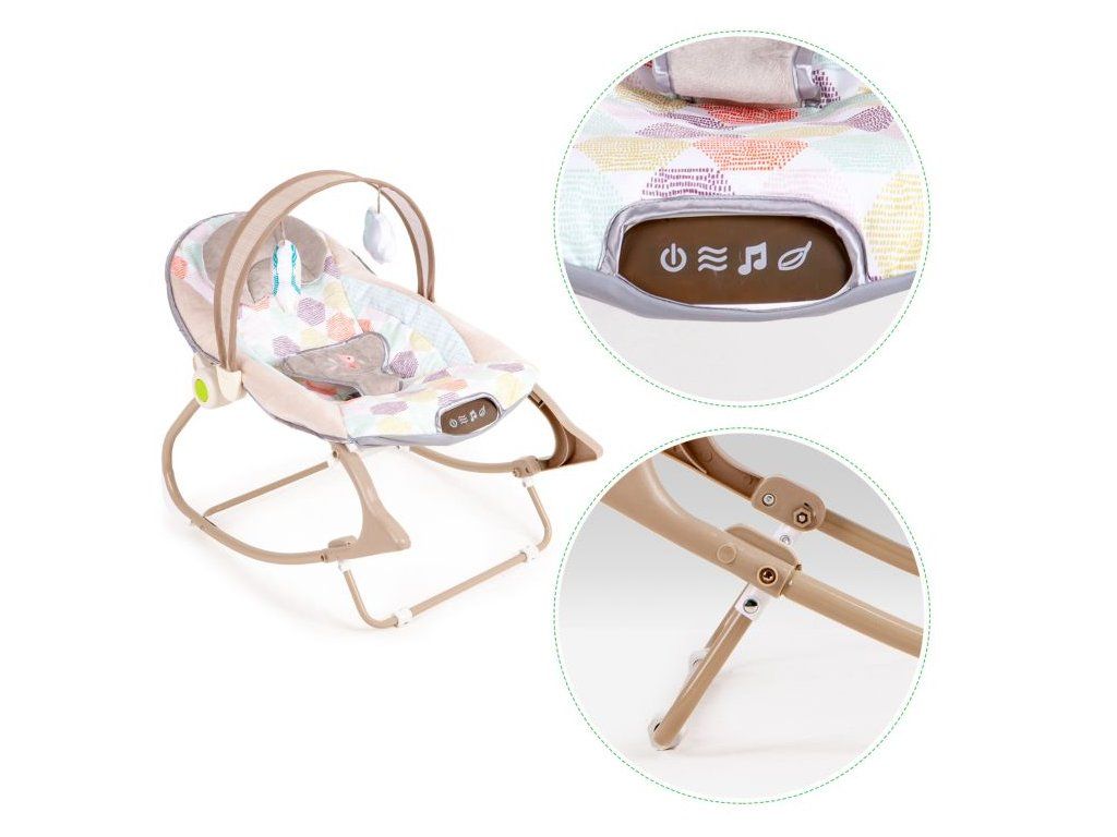 Lehátko je vybaveno multimediálním panelem s vibracemi a melodiemi, které pomáhají dítě uklidnit a zabavit. Součástí jsou také závěsné hračky, které podporují motorický rozvoj a stimulují smysly miminka.