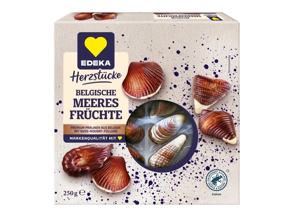 Objevte 22 jedinečných pralinek inspirovaných mořským světem – každý kousek je mistrovským dílem belgické čokoládové tradice. Edeka Herzstücke Belgische Meeresfrüchte kombinují jemnou čokoládu s bohatou nugátovou náplní s obsahem 23 % lískových oříšků. Ideální jako elegantní dárek, sladké potěšení pro hostynebo malé potěšení pro sebe.