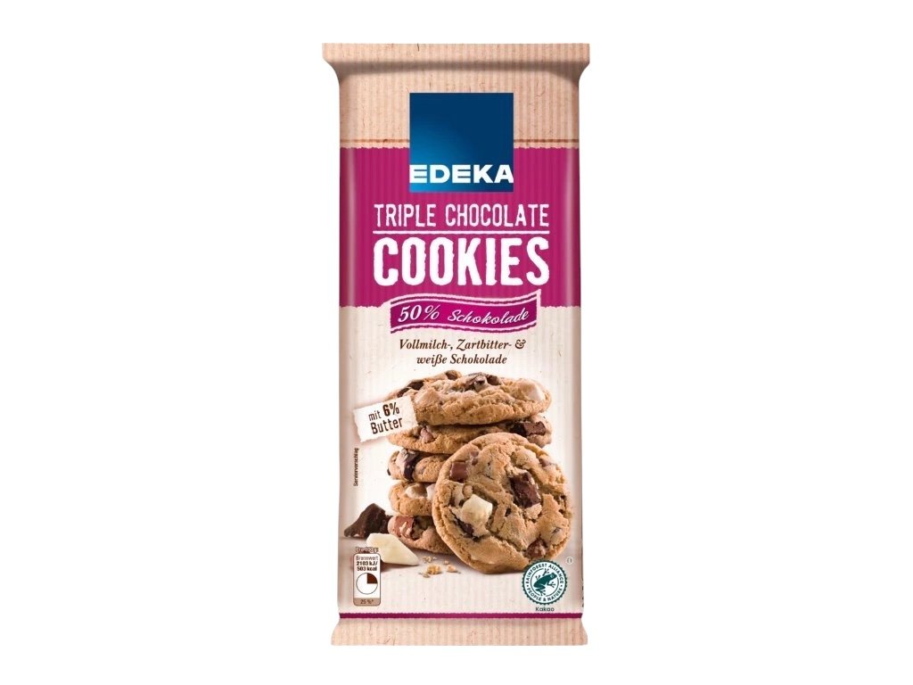 Trojí čokoládový zážitek: Edeka Triple Chocolate Cookies spojují všechny oblíbené druhy čokolády – mléčnou, hořkou a bílou, což znamená, že každé sousto je plné lahodného čokoládového potěšení.