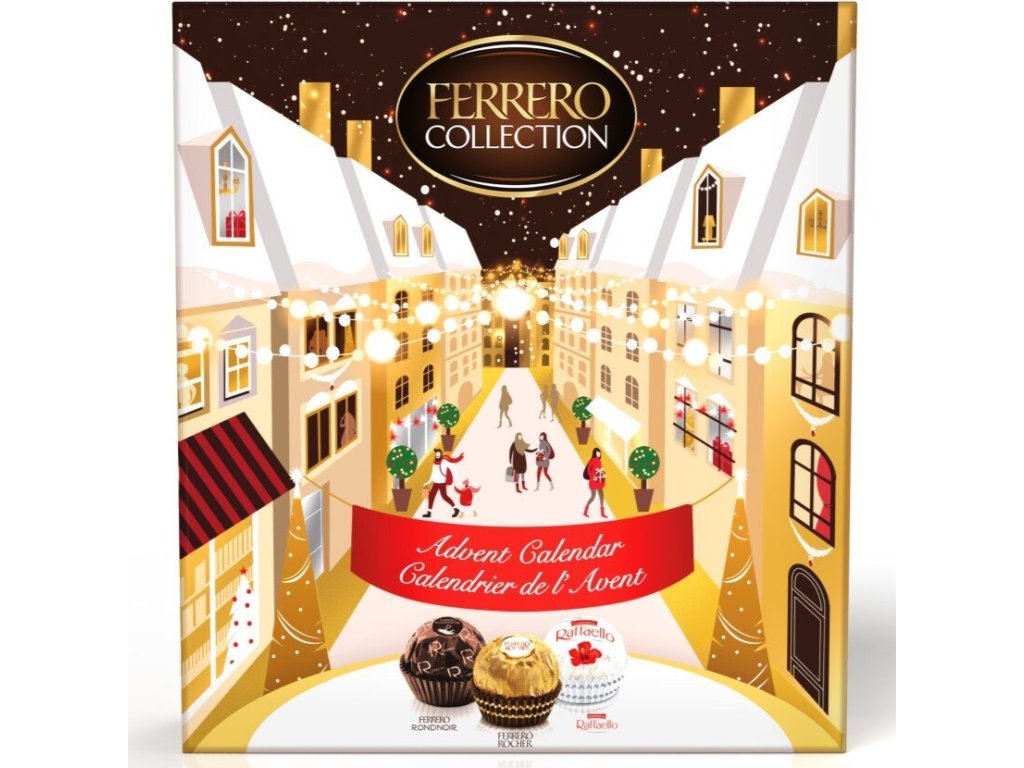 Kolekce tří druhů pralinek Ferrero v dárkové krabici. Ferrero Rocher, Ferrero Rondnoir a Raffaello.