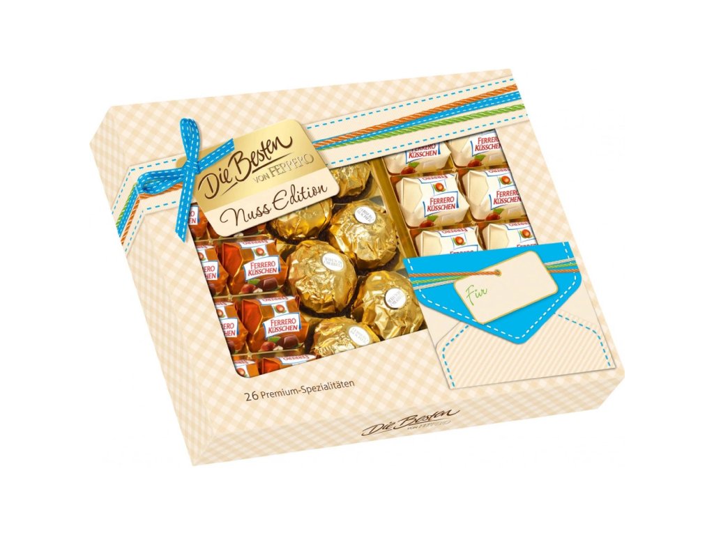 Požitek s ořechy. V edici The Best of Ferrero Nut najdete harmonickou trojici se skutečnými klasickými pralinkami. Ať už Ferrero Rocher, Ferrero Küsschen s mléčnou čokoládou nebo bílá křupavá edice: tady se toho sejde hodně.