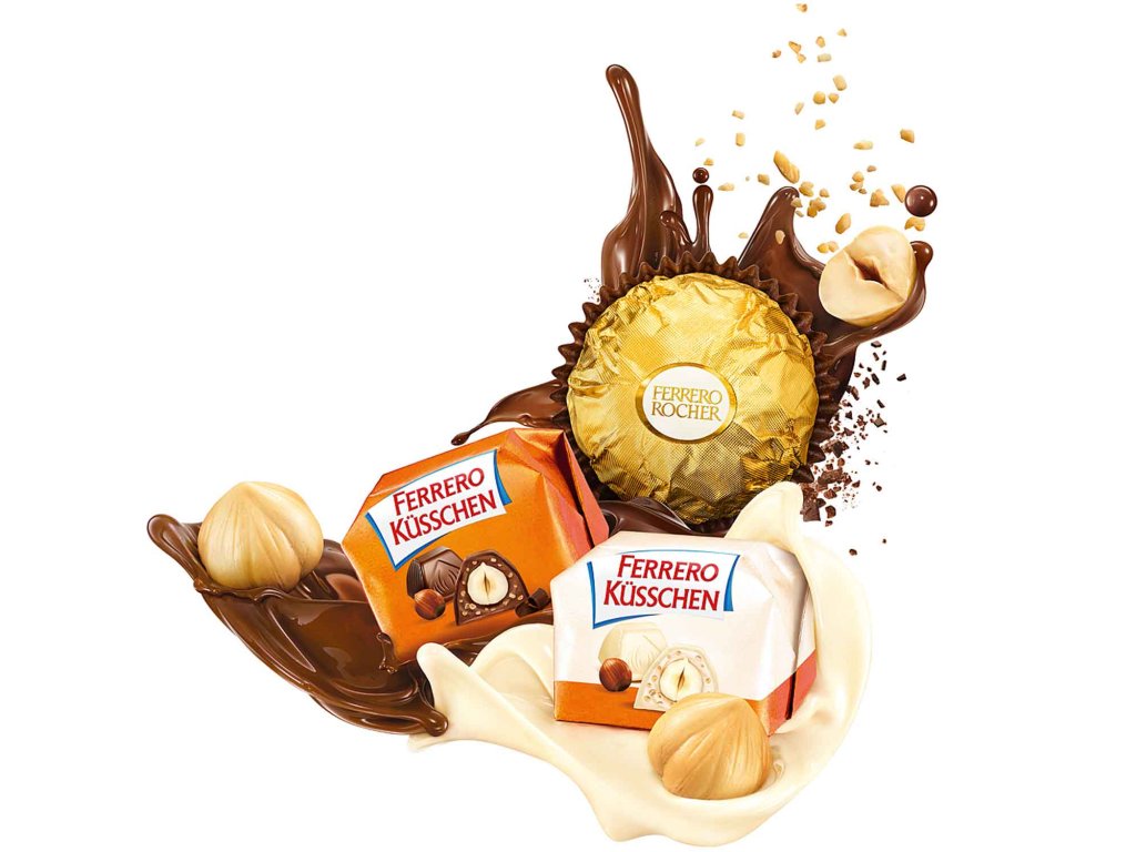 FERRERO KUESSCHEN CLASSIC: Lískovooříšková pralinka s jemnou mléčnou a hořkou čokoládou. ROCHER: Křupavá lískovooříšková pralinka s jemnou mléčnou čokoládou a jemným lískovooříškovým krémem (40,5 %) a celými lískovými oříšky. FERRERO KUESSCHEN CRUNCHY/WHITE: Lískovooříšková pralinka