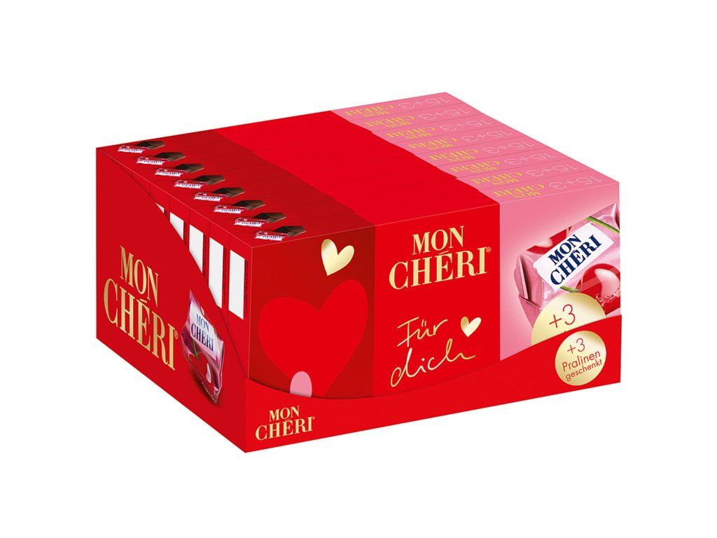 Naprostá klasika: Mon Chéri od Ferrera už od roku 1957 okouzluje nejen milovníky. Nyní jsou lahodné likérové třešňové pralinky k dispozici v limitované speciální edici v balení 15 plus tři zdarma. Tedy s celkem 18 ovocnými čokoládami. Každý z nich je naplněný jednou ze slavných, na slunci dozrálých piemontských třešních a nejlepším likérem. Směs je obalena v jemné polosladké čokoládě. Pralinka pro fajnšmekry s nejvyššími nároky.