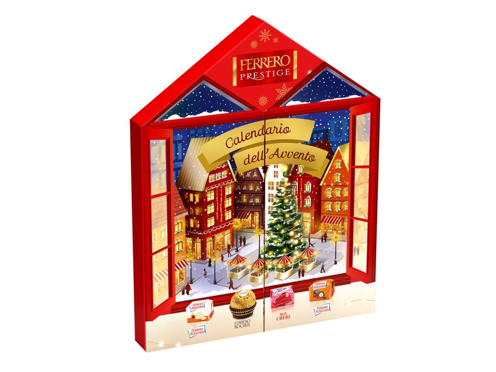 Ferrero Prestige – adventní kalendář s 24 pralinkami v kombinaci ikonických čokolád Ferrero: 6× Ferrero Küsschen White Crispy, 7× Ferrero Küsschen, 5× Ferrero Rocher a 6× Mon Chéri.