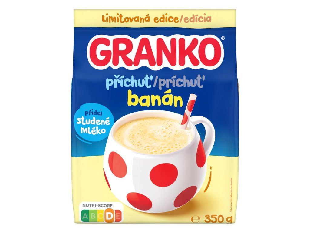 Granko banán 350 g je lahodný ochucený nápoj v prášku s jemnou banánovou příchutí, který si snadno připravíte během pár okamžiků. Stačí rozmíchat ve studeném mléce a vznikne chutný mléčný nápoj vhodný ke snídani, svačině nebo kdykoliv během dne. Díky své dobré rozpustnosti a příjemně sladké chuti si ho oblíbí děti i dospělí. Skvěle poslouží jako rychlé zpestření pitného režimu nebo sladká odměna.