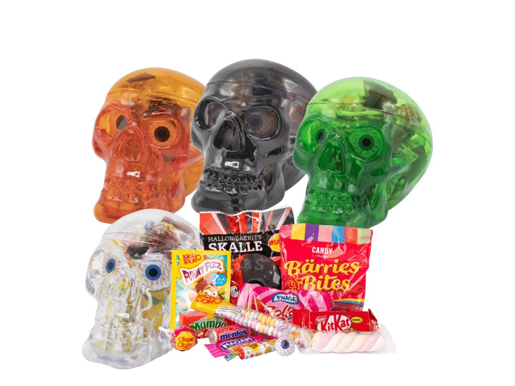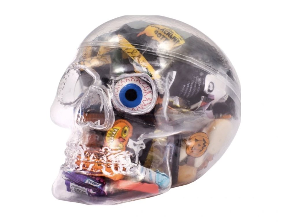 Hallowenská lebka plná sladkostí LIMITOVANÁ EDICE 333g. Uvnitř naleznete mnoho sladkostí bonbony a lízátka. Vhodné jako dárek nejen na Halloween. Obsahuje různé sladkosti - foto ilustrační