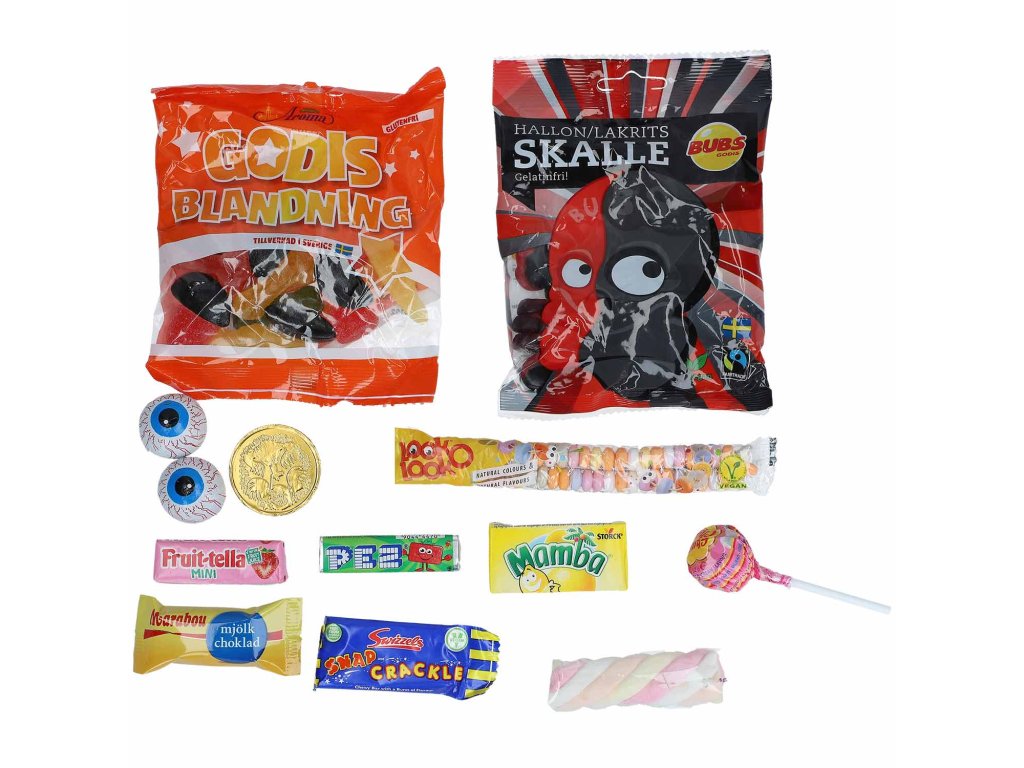 Složení: Cukr, glukózo-fruktózový sirup, želatina, sušené plnotučné mléko, kakaová hmota, kakaové máslo, sušená syrovátka (mléko), sušené odstředěné mléko, máselný tuk, syrovátkový permeát, emulgátor (sójový lecitin), kukuřičný škrob, modifikovaný škrob, dextróza, voda, regulátor kyselosti (kyselina citronová, kyselina jablečná, citrát sodný), kyselina mléčná, dextróza, aromata, extrakt z lékořice, salmiak, přírodní vanilkové aroma, vanilin, kyselina karmínová, zvlhčovadlo (sorbitolový sirup, glycerin), hydrolyzovaný sójový protein, kyselina stearová, zelenina Olej (kokosový olej, řepkový olej, palmový tuk, palmojádrový olej), emulgátor (E435, glycerolmonostearát), antioxidant (alfa-tokoferol). ), ovocné a rostlinné pyré/džus/koncentrát (pomeranč, citron, jahoda, jablko, třešeň, ananas, limetka, broskev, banán, borůvka, ostružina, mango, meloun, kiwi, černý rybíz, arónie, mučenka, hroznové víno, mrkev, černá mrkev, bez, červená řepa, světlice barvířská, ředkvička, batáty, spirulina), barviva (koncentrát z černé mrkve, karamelové barvivo, kyselina karmínová, měďnaté komplexy chlorofylu, rostlinné uhlí, betakaroten, extrakt z kurkumy, paprikový oleoresin, betanin, antokyany, lutein, kurkumin), separátor (stearát hořečnatý, uhličitan hořečnatý, mono- a diglyceridy mastných kyselin), maltodextrin, želírující látka (arabská guma), leštící látka (karnaubský vosk, bílý a žlutý včelí vosk), roztok karamelového cukru, stabilizátor (agar), dextrin, sůl.