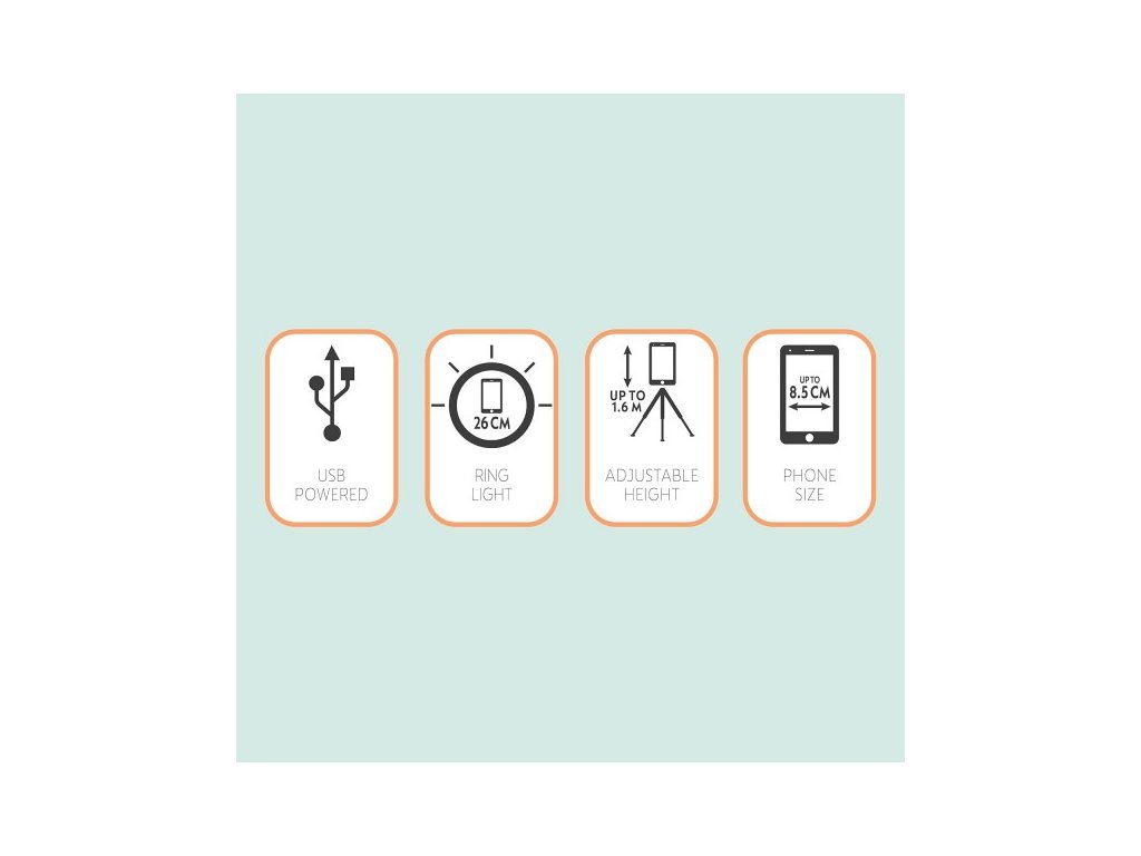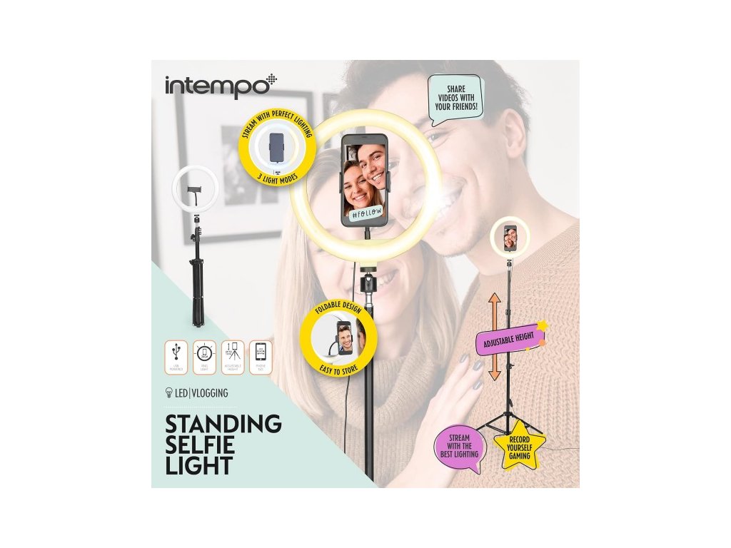 Kruhové selfie světlo Intempo je ideálním pomocníkem pro focení, natáčení videí, livestreamy i online hovory. Díky nastavitelnému stojanu a třem režimům osvětlení zajistí vždy perfektní světelné podmínky.