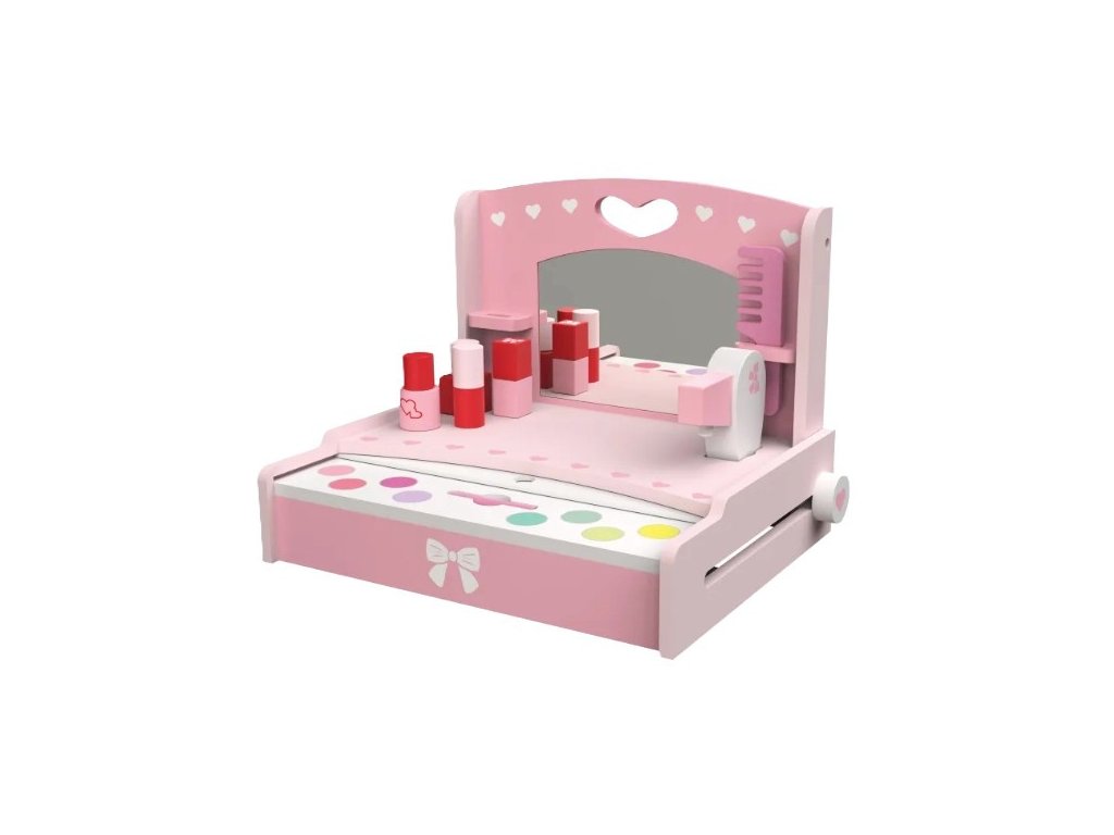 Dřevěný toaletní stolek KidLand je krásná hrací sada, která dětem umožní napodobovat každodenní rituály a rozvíjet fantazii, kreativitu i jemnou motoriku. Praktické provedení s rukojetí umožňuje stolek jednoduše složit a veškeré doplňky bezpečně uložit dovnitř, takže je ideální i na přenášení.