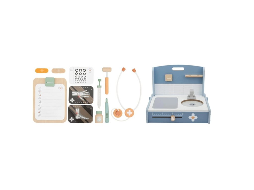 Dřevěná stolní klinika KidLand je hravá sada pro malé doktory a doktorky, která děti vtáhne do světa lékařských rolí. Praktické provedení s rukojetí umožňuje kliniku snadno složit a veškeré příslušenství uložit dovnitř, takže je ideální i na přenášení. Hra podporuje fantazii, kreativitu a rozvoj sociálních dovedností zábavnou formou.