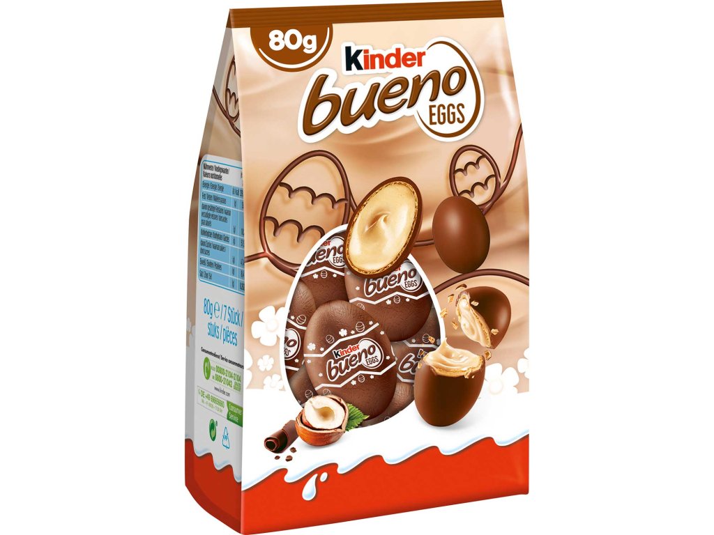 Křupavá vafle na povrchu, krémové jádro uvnitř. Lahodné Kinder Bueno Eggs přinášejí radost z koledování vajíček. Jemná oříšková krémová náplň je obklopena křupavou oplatkou a pokryta jemnou mléčnou čokoládou. Vychutnejte si čokoládová vajíčka celá, nebo ujídejte kousek po kousku.