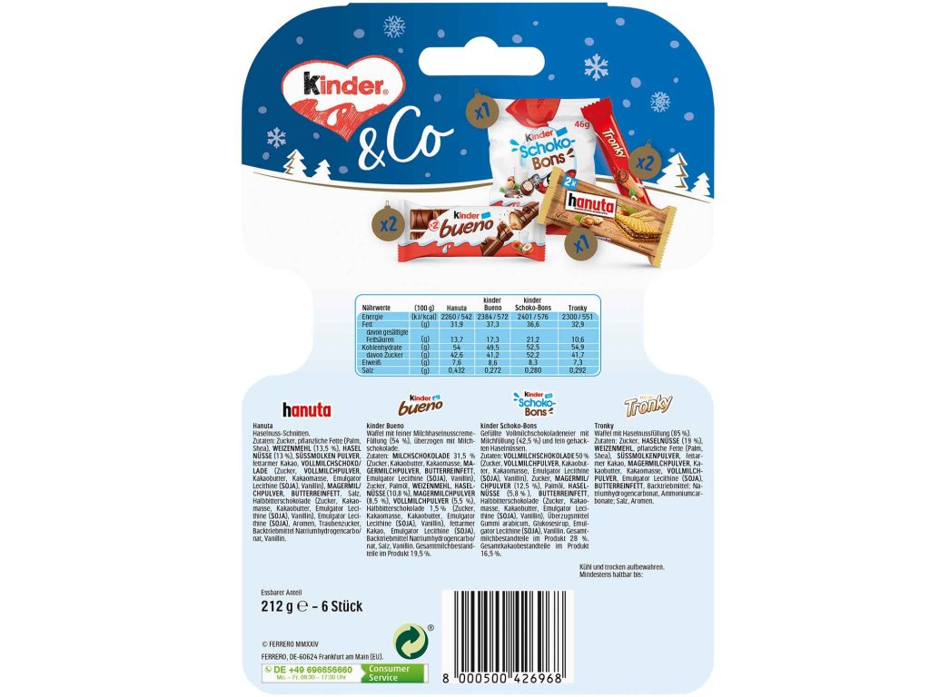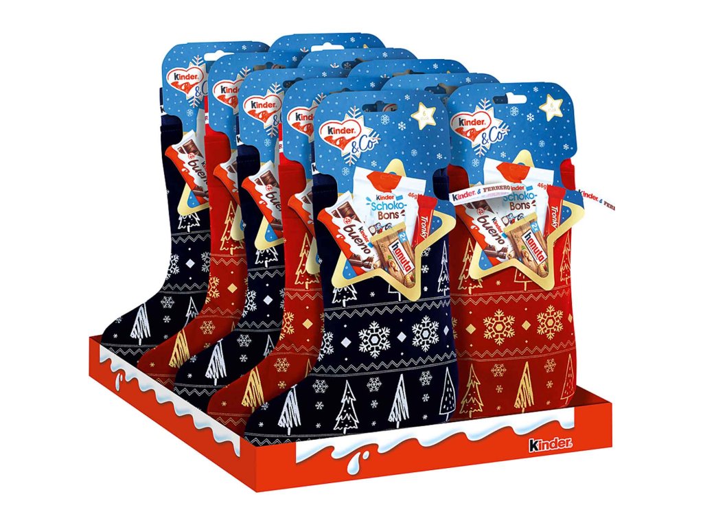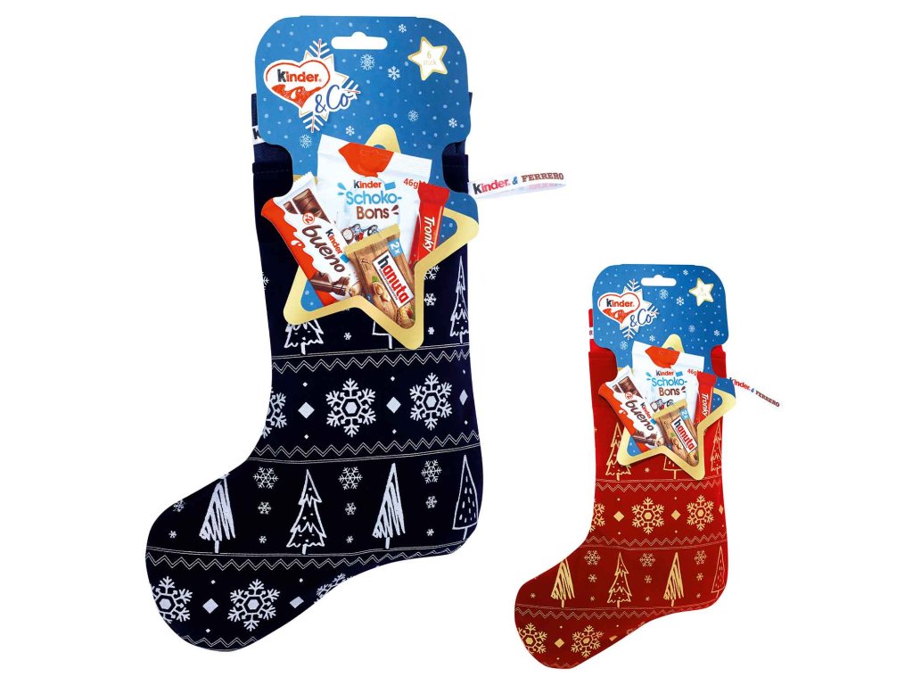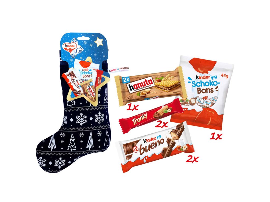 Punčoška plná překvapení! Vtipná ponožka Kinder & Co. je vítaným dárkem nejen na Mikuláše. Kvalitní látková ponožka byla navržena na Vánoce a je až po okraj naplněna různými lahůdkami od Ferrera. S Kinder Bueno, Hanuta, Kinder Schoko-Bons a Tronky je pestrá zábava při občerstvení zaručena.