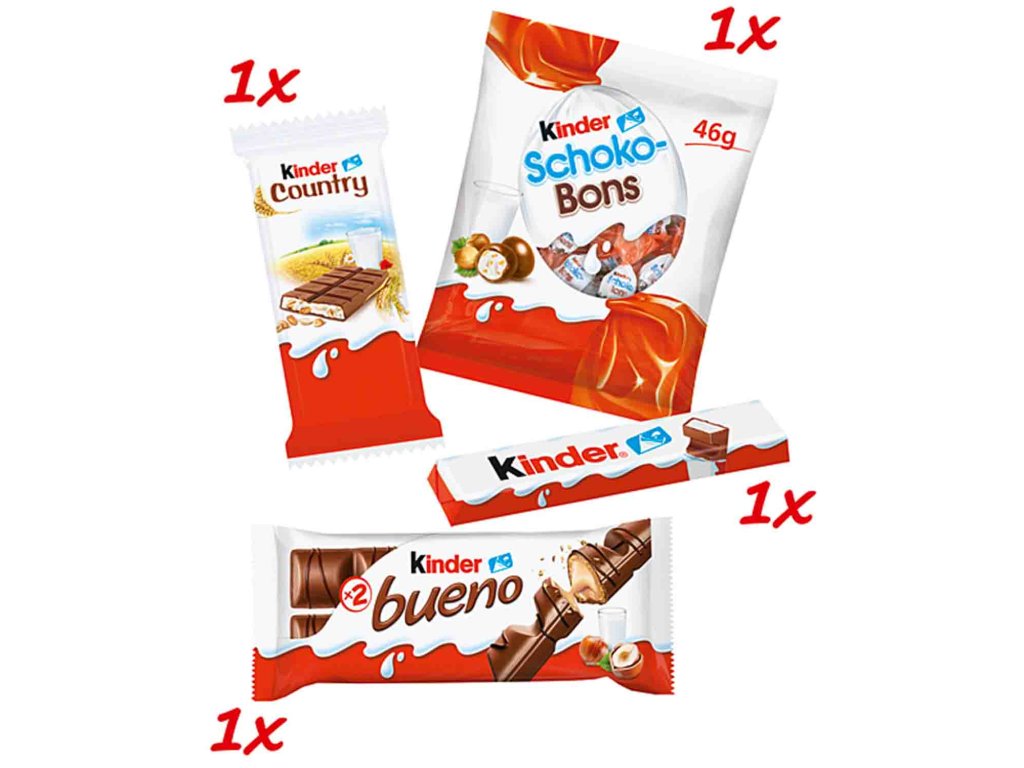 Obsah sladkostí: Kinder Country, Kinder Chocolate maxi, Kinder Bueno, Kinder Schoko bons (celkem 133g)