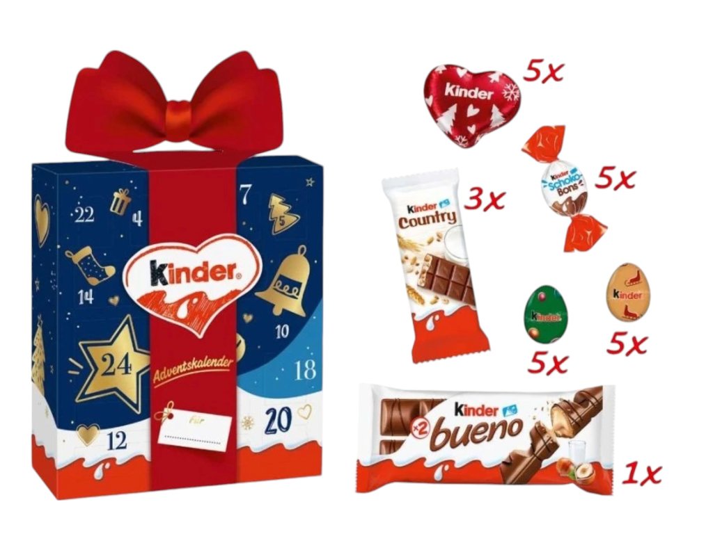 - 24 čokoládových specialit: Kalendář obsahuje pestrou škálu čokoládových výrobků od značky Kinder, které