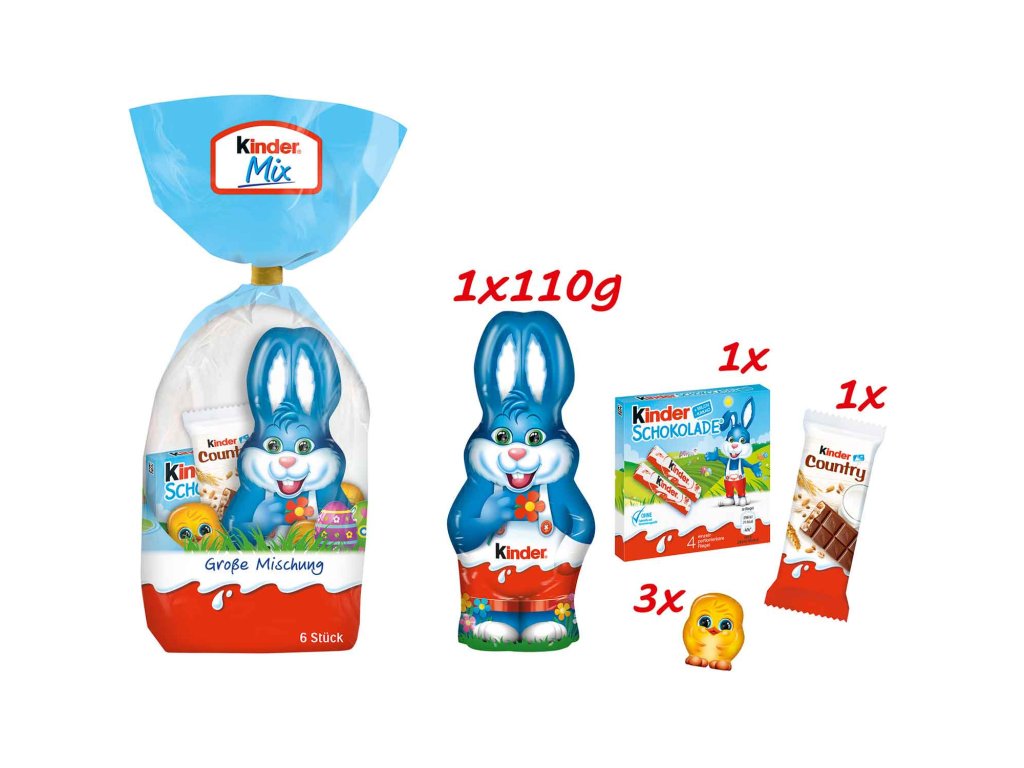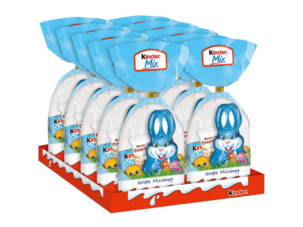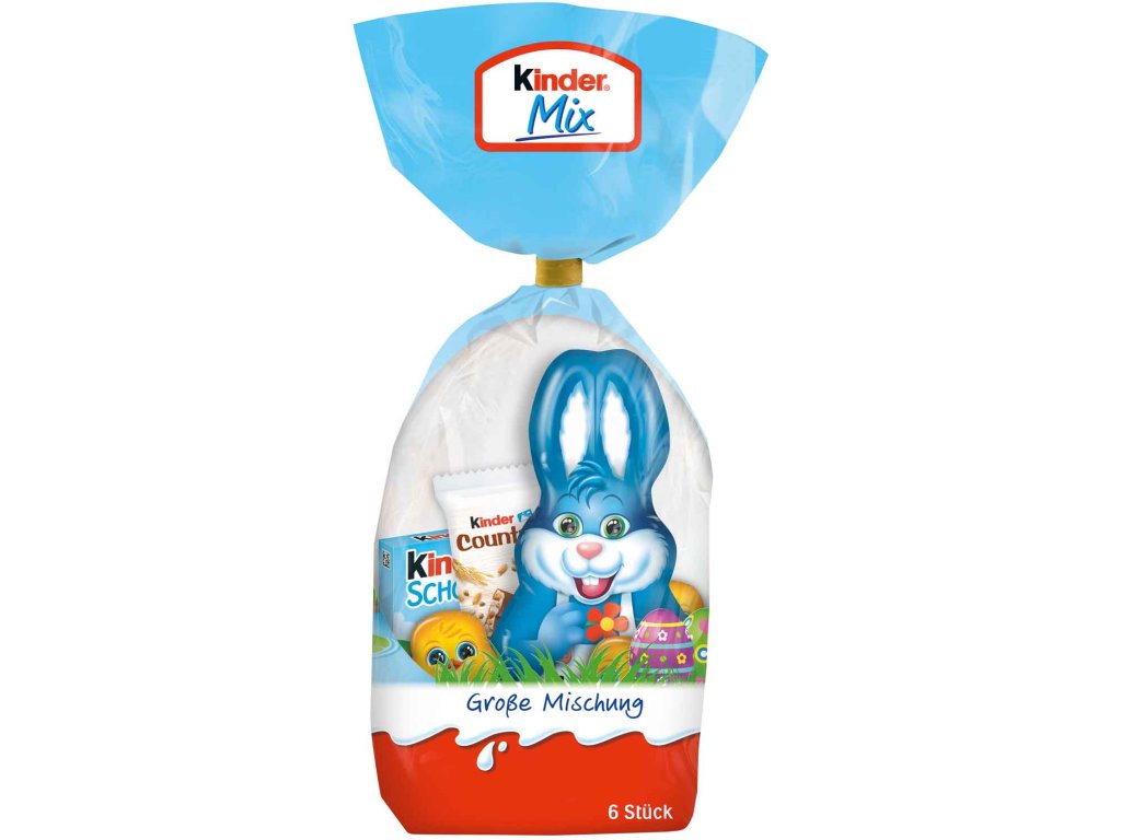 Velikonoční směs. Kinder Mix Large Mix je ideálním nápadem na Velikonoční dárek, protože tento mix obsahuje vše, po čem čokoládové srdce touží. Kromě velké figurky velikonočního zajíčka zde najdete nejoblíbenější dětské mini a další překvapení. Užijte si velikonoční období s tímto barevným výběrem sladkých dobrot.