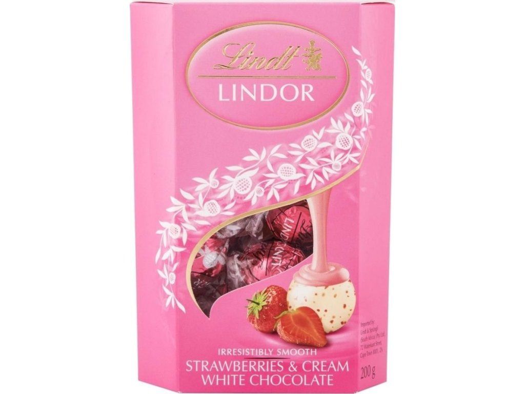 Lindt Lindor pralinky jahoda a smetana. Bílá čokoláda s kousky jahod a smetanou s jemnou krémovou náplní.