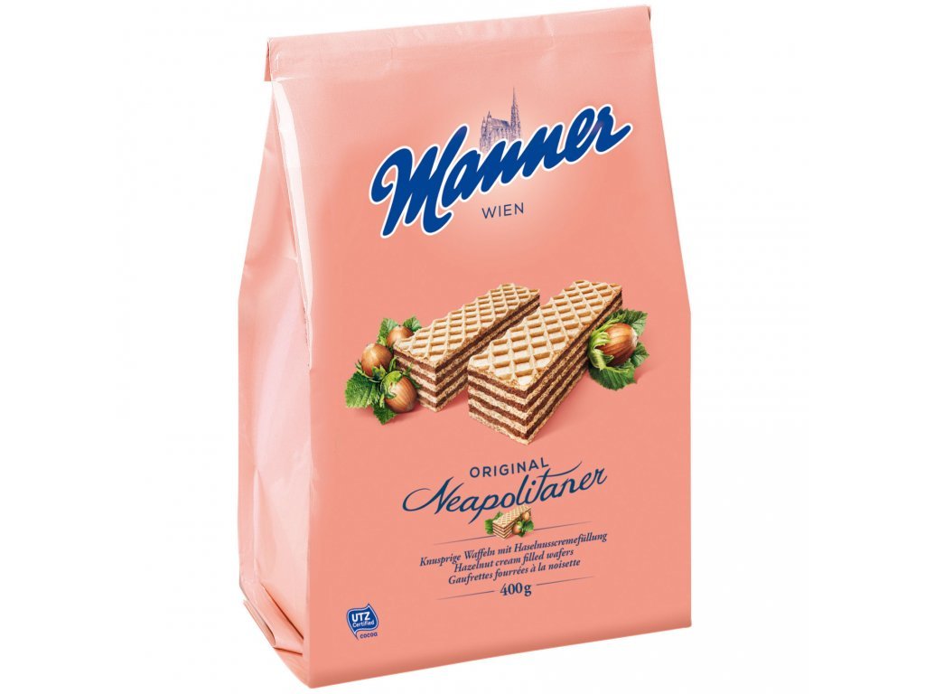 Křupavé sendviče. Originální neapolské vafle Manner jsou sladkou pochoutkou z Rakouska. Mezi několika vrstvami křupavé oplatky je jemný krém z lískových oříšků, který se jemně roztaví na jazyku a rozvine jeho lahodnou chuť. Křehký plátek je rozdělen na kousky velikosti kousnutí a je možné jej okamžitě sníst.