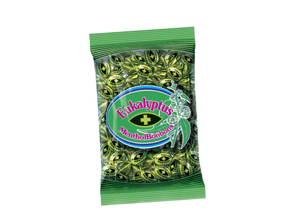 Složení: glukózový sirup, cukr, eukalyptový olejíček (0,3%), mátový olejíček (0,1%). Výrobek může obsahovat SÓJU a MLÉKO.