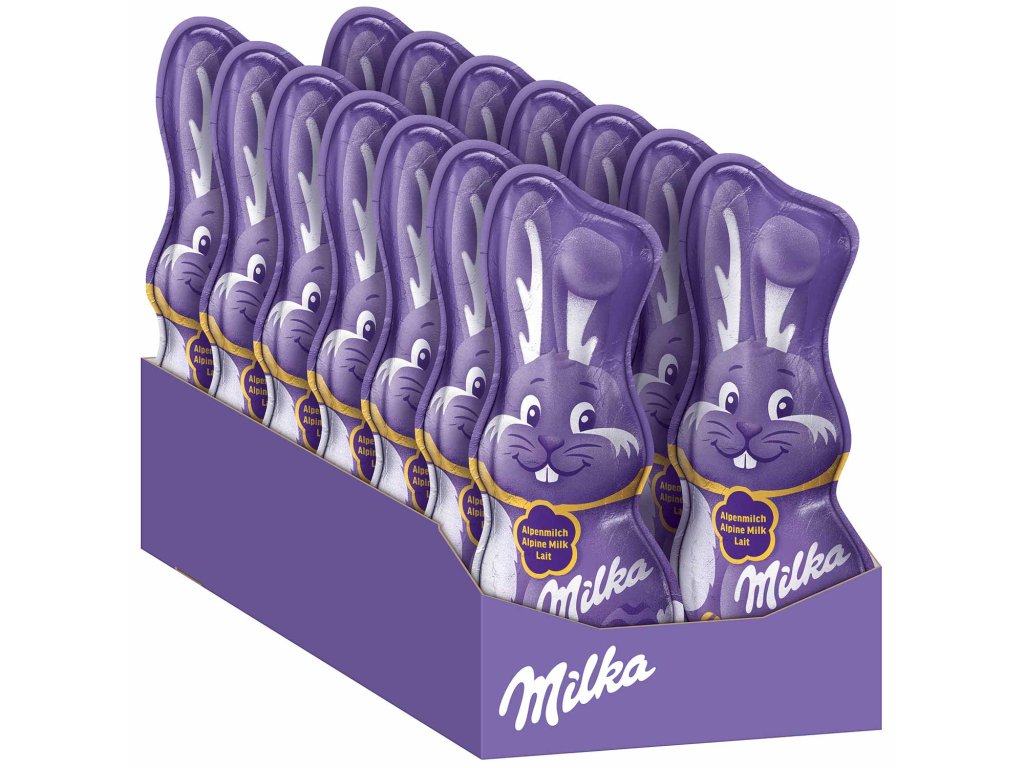Usměvavý zajíček Milka Alpenmilch i letos vykouzlí na tvářích dětí i dospělých zářivý úsměv, protože usměvavý zajíček je všude oblíbený. Jemná alpská čokoláda z plnotučného mléka se lahodně rozplývá na jazyku a zajišťuje vynikající požitek. Figurka je vysoká cca 17,5 cm a je vhodná nejen jako dárek do velikonočního košíku, ale dobře vypadá i jako dekorace na velikonoční stůl.