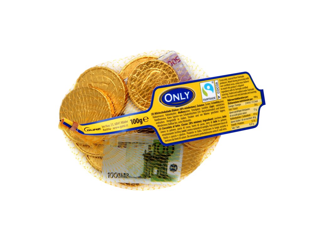 Zlaté mince z mléčné čokolády jsou baleny v síťce obsahující 100 g čokolády. Pro zachování kvality a chuti skladujte čokoládu na chladném, suchém místě a mimo přímé sluneční světlo.