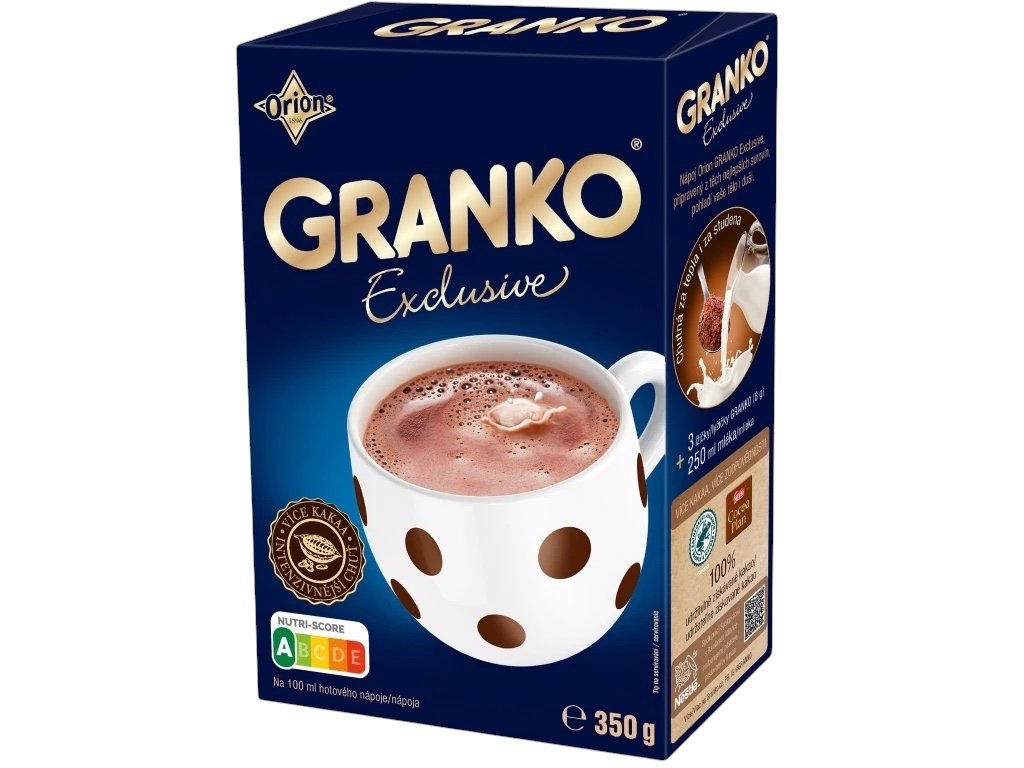 Návod k přípravě: Chutný kakaový nápoj získáte smícháním 5 lžiček (13,5g) Granka Exclusive s 250 ml teplého nebo studeného polotučného mléka.