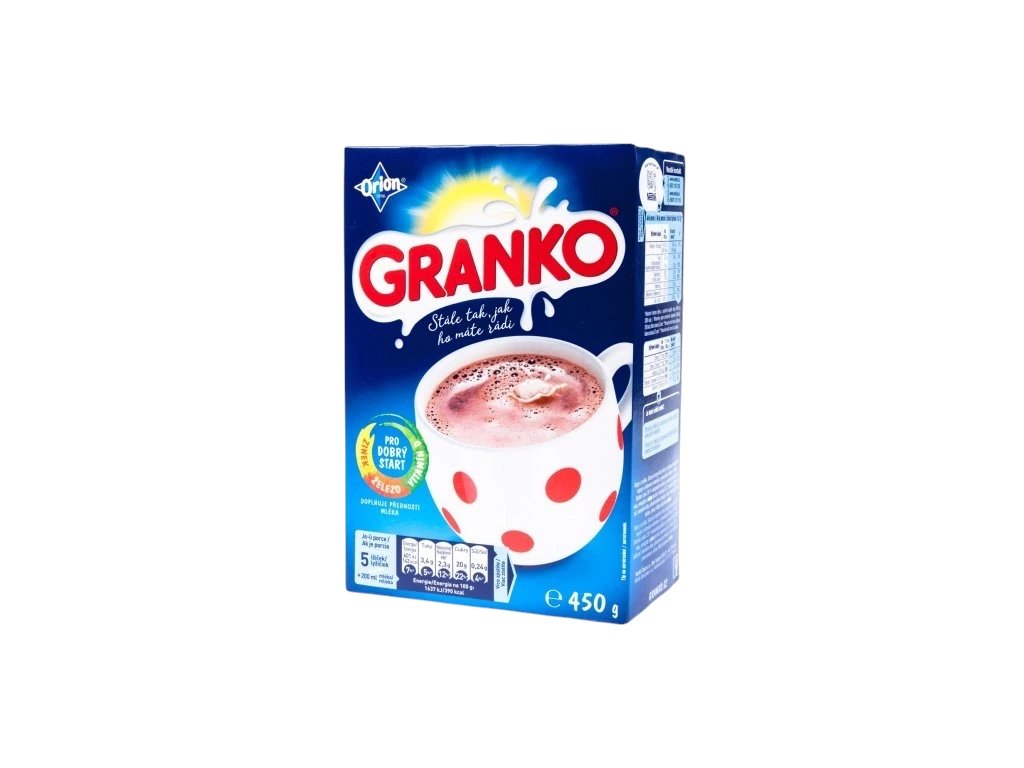 Návod k přípravě: Chutný kakaový nápoj získáte smícháním 5 lžiček (13,5g) Granka s 250 ml teplého nebo studeného polotučného mléka.