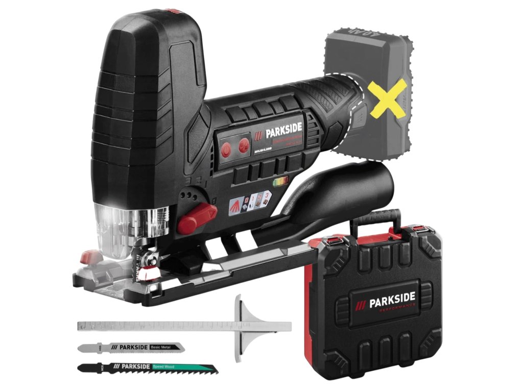 Pila je kompatibilní s běžnými pilovými listy s jednovačkovou stopkou (např. Parkside, Bosch, Metabo, Makita) a umožňuje připojení externího odsávání prachu pomocí přiloženého adaptéru. Dodávána je v praktickém kufru pro snadné skladování a přenos.