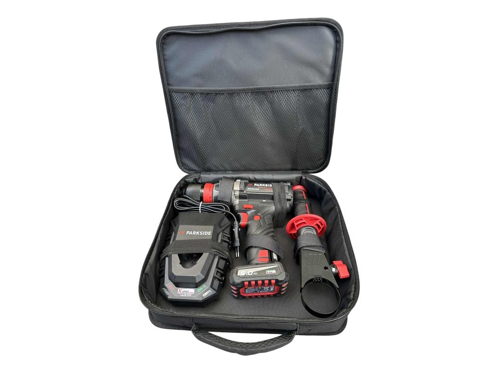 Součástí balení je akumulátor 12 V / 5 Ah, rychlonabíječka 6 A, přídavné držadlo a praktická úložná taška. Kompatibilní se všemi akumulátory PARKSIDE X 12 V Team.