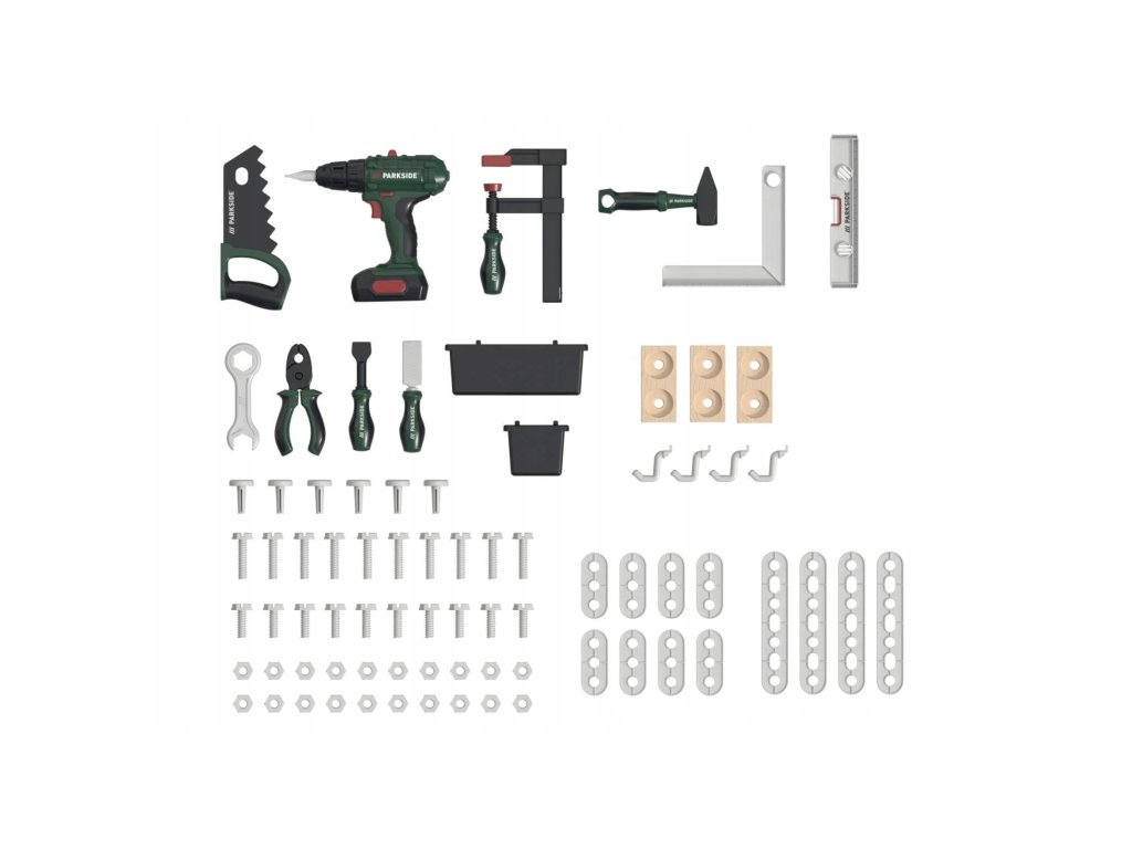 Aku šroubovák, kladivo, ráčnový klíč (otevřený i očkový), pilník, šroubovák, svěrka, pilka, kleště, vodováha, úhelník, 2 úložné boxy, háčky, „dřevěné“ dílky se suchým zipem, hřebíky, velké i malé šrouby, matice a různé spojovací prvky.