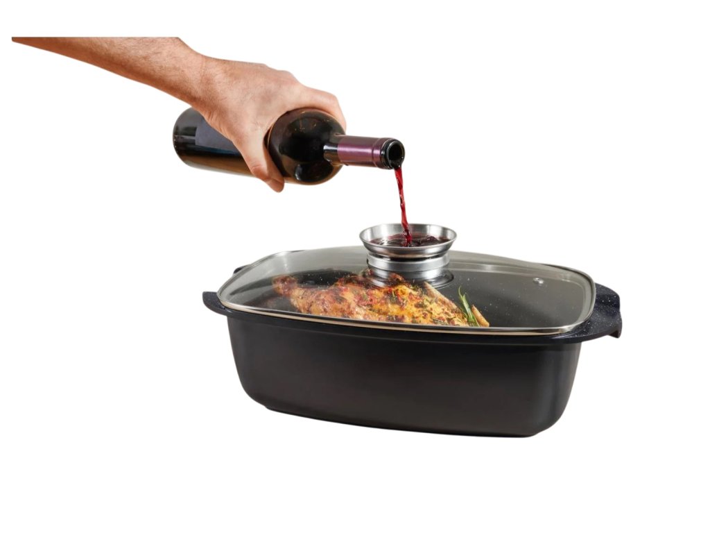 Aroma ventil ve víku pro rovnoměrné a jemné podlévání pokrmů