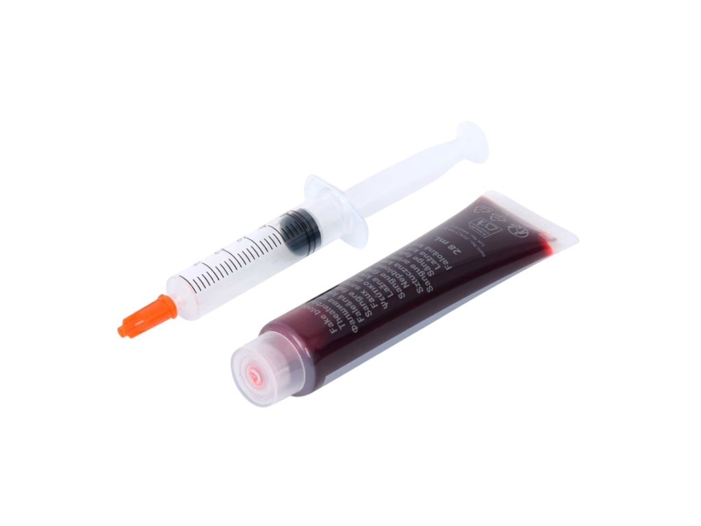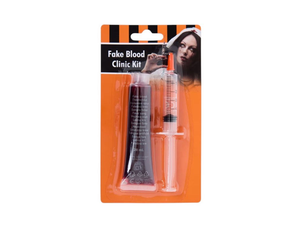 Jednoduché, ale šokující řešení: Připravena k použití. Obsahuje umělou krev i praktickou stříkačku pro dávkování – udělejte si doma svůj upírský efekt, jak jen chcete.