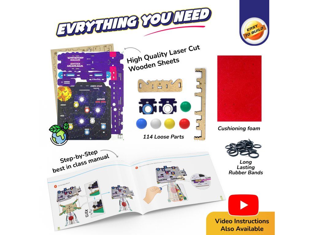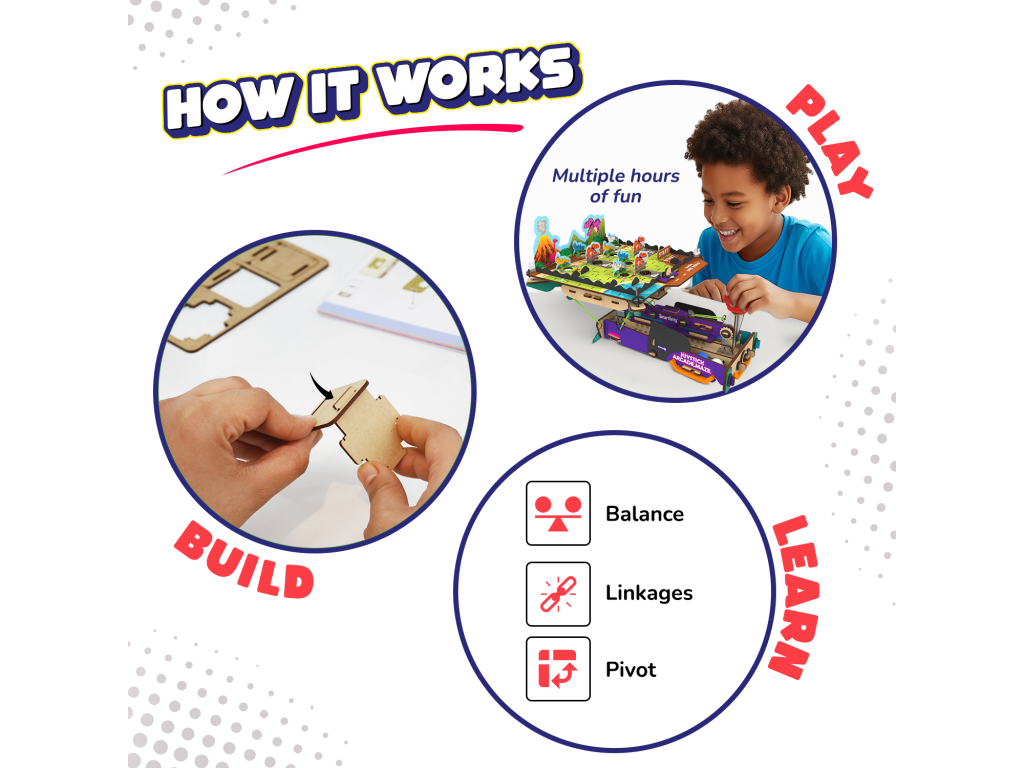 Nejdříve je nutné model sestavit podle obrázkového návodu. Spoje i herní mechanika využívají dřevěné desky a volné dílky – žádné baterie ani lepidlo. Děti si nejdříve postaví vlastní pákou ovládanou pohyblivou herní plochu a pak si mohou s rodinou nebo kamarády zahrát zasoutěžit. Bezpečné, ekologické, hravé a poučné – přesně tak, jak má vypadat moderní hračka.