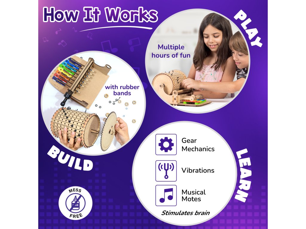 Nejdříve je nutné model sestavit podle obrázkového návodu. Spoje i funkce jsou založené na gumových páscích, pohyb kladívek a přehrávání písní je řízeno mechanickým ozubeným převodem. Po sestavení vznikne plně funkční mechanický xylofonový hudební stroj, kde otáčením kliky se spouští mechanismus, jenž úderem na kovové desky (sound plates) vytváří melodie.