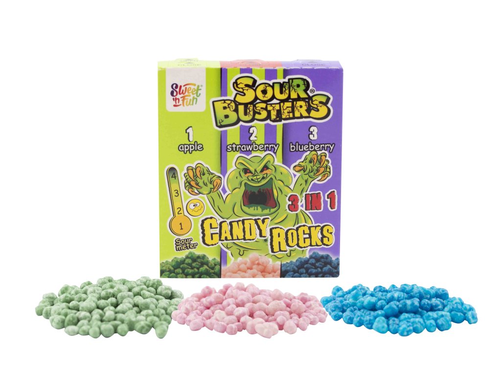Složení: cukr, dextróza, regulátor kyselosti: E330, stabilizátor: E414, aroma, barviva: E133, E141, E162.