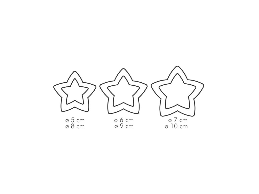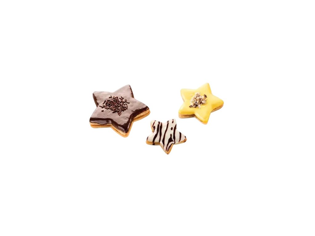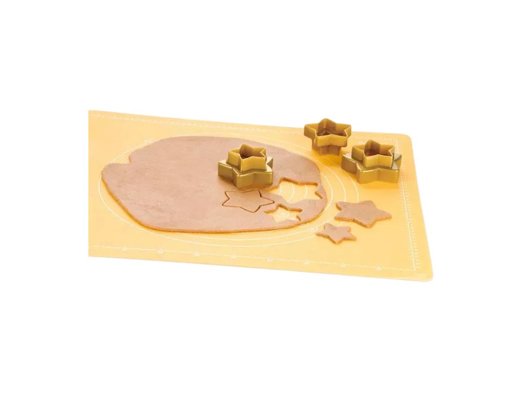 Stylová sada 3 zlatých vykrajovátek ve tvaru hvězdy z řady DELÍCIA od TESCOMY. Oboustranný design nabízí hladké i vroubkované okraje pro kreativní pečení cukroví, perníčků i sušenek. Vyrobeno z kvalitního plastu vhodného pro styk s potravinami. Snadná údržba – lze mýt v myčce.