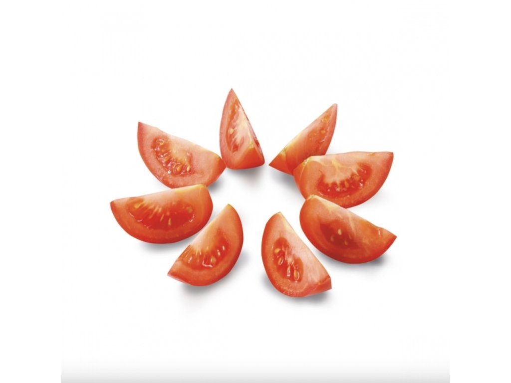 Postup: Kráječ položte na střed rajčete a mírným tlakem kolmo dolů naporcujte. Spodní část rajčete rozkrojte kolébavým pohybem kráječe. Kráječ není vhodný na porcování velmi měkkých a přezrálých rajčat.