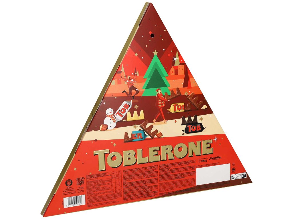 Sladké Vánoce vrcholí v prosinci. Skvělý adventní kalendář Toblerone překvapí nejen svým jedinečným tvarem, který září v lesklém trojúhelníku a je potištěn vánoční grafikou. Kalendář vás každý den odmění lahodnou specialitou Toblerone. Ne nadarmo je trojúhelníková švýcarská mléčná čokoláda světoznámá a svou neodolatelnou chutí vás bude hýčkat každý den.