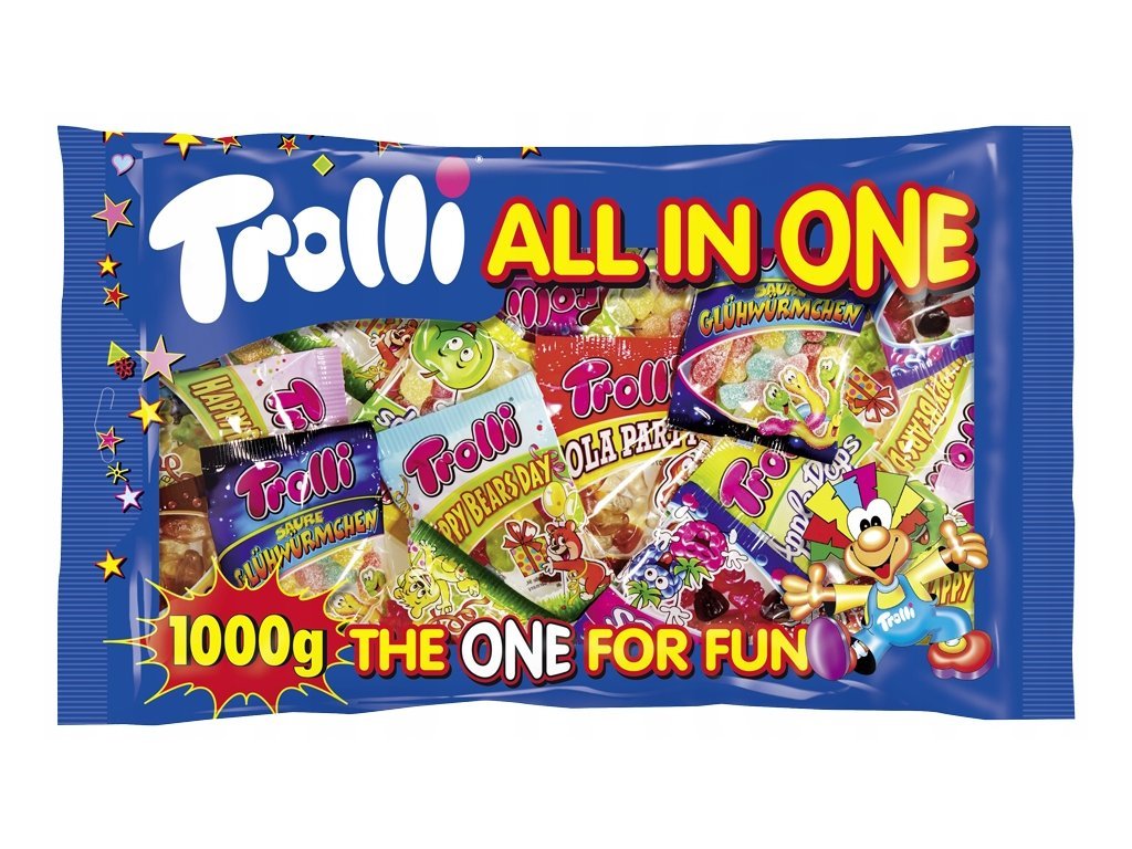Trolli All in one - směs toho nejprodávanějšího od Trolli. Jednotlivě balené druhy ovocného želé v malých sáčcích (50x 20g). Velké balení o hmotnosti 1 kg.