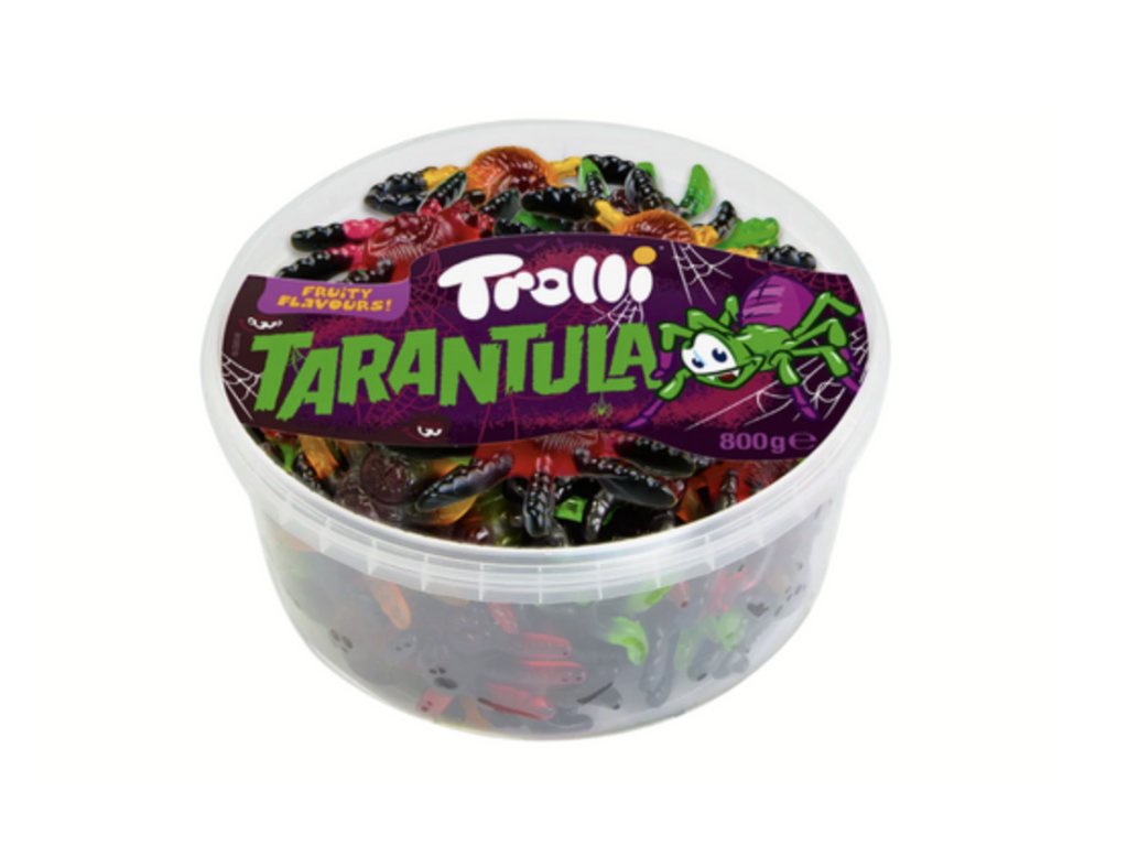 Plná dóza extra měkkých želé pavouků. Svou ovocnou chutí a velkým lesklým tělem, Trolli Tarantule loví milovníky Trolli. Pokud se chytíte do těchto pavoučích sítí, určitě si užijete spoustu legrace. Děsivě lahodní a cca 6 x 6 cm velcí osminozí přátelé přesvědčují svým detailním vzhledem - a v neposlední řadě ovocnou chutí malin, ostružin, jablka, jahody a pomeranče.